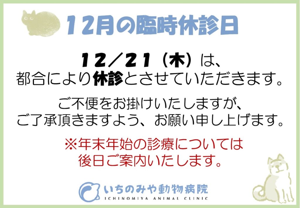 🔸12月の臨時休診日🏥 投稿日 2023年11月28日 著者 ichinomiya-ac カテゴリー お知らせ 12/21(木)は、都合により休診とさせて頂きます。※年末年始の診療については、後日ご案内いたします。 ご不便をおかけいたしますが、ご了承頂きますよう、よろしくお願い申しあげます。 この記事を書いた人 ichinomiya-ac 記事一覧