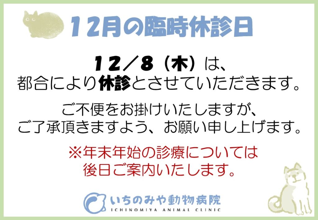 🔸12月の臨時休診日🏥 投稿日 2022年11月20日 著者 ichinomiya-ac カテゴリー お知らせ 12/8(木)は、都合により休診とさせて頂きます。※年末年始の診療については、後日ご案内いたします。 ご不便をおかけいたしますが、ご了承頂きますよう、よろしくお願い申しあげます。 この記事を書いた人 ichinomiya-ac 記事一覧