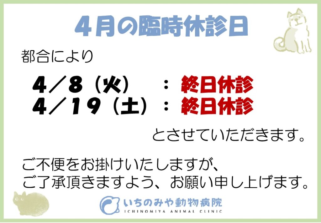 🔸4月の臨時休診日📌変更 🏥 投稿日 2025年3月24日 著者 ichinomiya-ac カテゴリー お知らせ 先日のご案内に変更がございます。ご迷惑をおかけいたします。 4/8(火) と、 4/19(土) は、終日休診 とさせて頂きます。 その他は、日曜・祝日午後休診。水曜日休診です。ご不便をおかけいたしますが、ご了承頂きますよう、よろしくお願い申しあげます。 この記事を書いた人 ichinomiya-ac 記事一覧