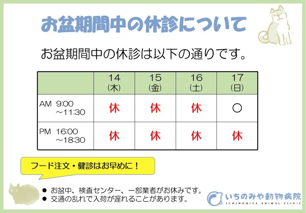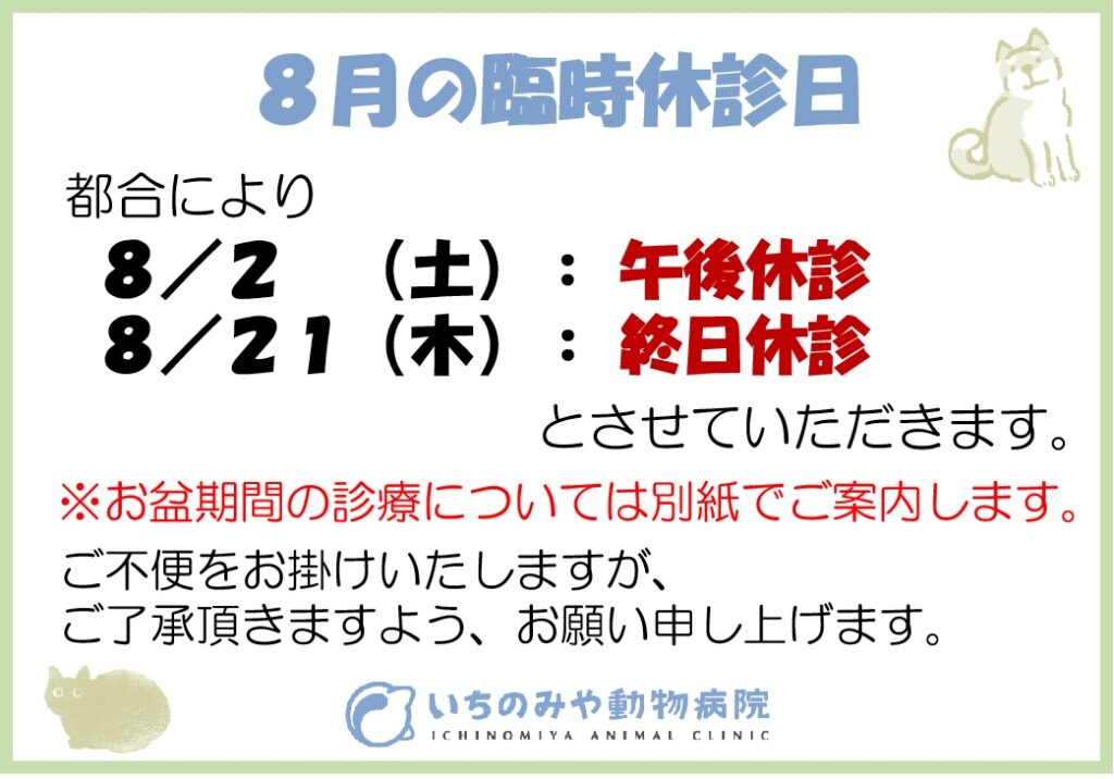 🔸8月・お盆期間の臨時休診について🏥🔶変更有 投稿日 2025年7月7日 更新日 2025年7月17日 著者 ichinomiya-ac カテゴリー お知らせ 休診日の追加※がございます。ご不便をおかけいたしますが、何卒ご了承ください。 ■8/2 (土):午後休診 ■8/21(木): 終日休診 ※<お盆期間> ■8/14(木)~16(土):終日休診 とさせて頂きます。 その他は、日曜・祝日午後休診。水曜日休診です。ご不便をおかけいたしますが、ご了承頂きますよう、よろしくお願い申しあげます。 この記事を書いた人 ichinomiya-ac 記事一覧