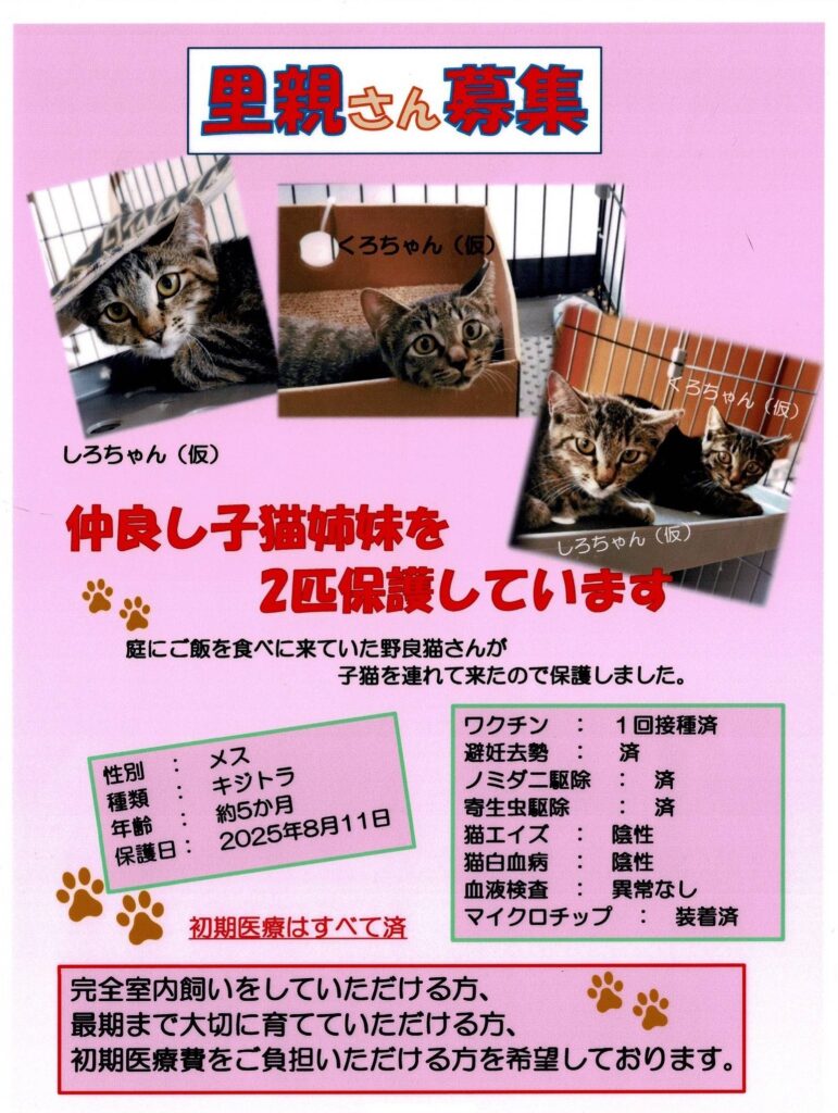 🔶🔷里親さん募集🐈子猫ちゃん 投稿日 2025年9月9日 更新日 2025年9月15日 著者 ichinomiya-ac カテゴリー 里親募集 推定5カ月齢の子猫ちゃんの里親さんを募集しています。 ・推定5カ月齢・キジトラ・女の子(避妊手術済)・ノミダニ、寄生虫駆虫済み・ワクチン1回接種済・ウイルス検査陰性・血液検査異常なし・マイクロチップ装着 保護主様のインスタグラムで子猫姉妹の動画が投稿されています。ぜひご覧ください! Instagramwww.instagram.com 現在保護主さまのお宅にいますので、興味のある方はお声がけください🙏🏻 この記事を書いた人 ichinomiya-ac 記事一覧