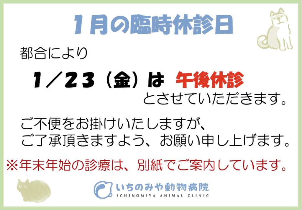 🔸1月の臨時休診日🏥 投稿日 2025年12月19日 著者 ichinomiya-ac カテゴリー お知らせ 1/23(金) は、午後休診 とさせて頂きます。※年末年始の診療については、別紙でご案内しております。 その他は、日曜・祝日午後休診。水曜日休診です。ご不便をおかけいたしますが、ご了承頂きますよう、よろしくお願い申しあげます。 年末年始のご案内です。 この記事を書いた人 ichinomiya-ac 記事一覧