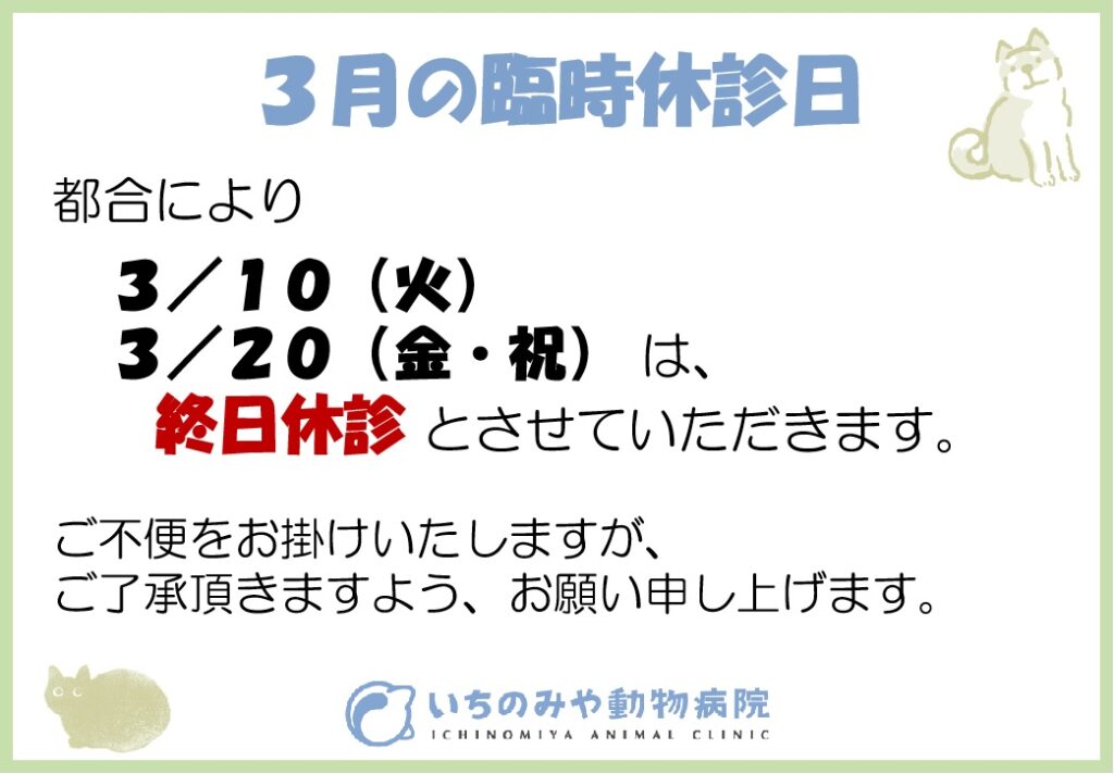 🔸3月の臨時休診日🏥🔶変更有 投稿日 2026年2月22日 更新日 2026年2月24日 著者 ichinomiya-ac カテゴリー お知らせ 休診日の変更※がございます。ご不便をおかけいたしますが、何卒ご了承ください。 ■3/10(月):終日休診※ ■3/20(金・祝):終日休診 とさせて頂きます。 その他は、日曜・祝日午後休診。水曜日休診です。ご不便をおかけいたしますが、ご了承頂きますよう、よろしくお願い申しあげます。 この記事を書いた人 ichinomiya-ac 記事一覧